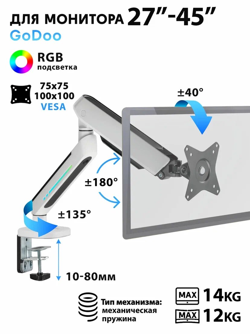 Кронштейн для монитора Godoo 27"-45" дюймов настольный с RGB подсветкой LDT54-C012HL Fine Texture White информация: