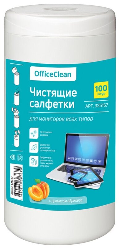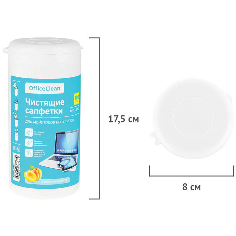 Салфетки влажные чистящие 100 штук для экранов мониторов всех типов электроники OfficeClean / салфетки плотные с ароматом абрикоса 13*16 см информация: