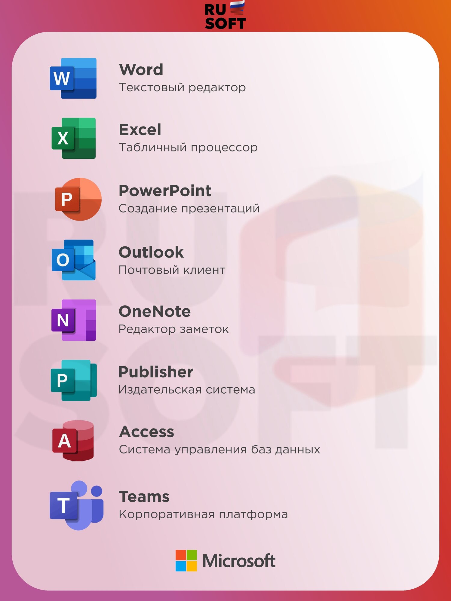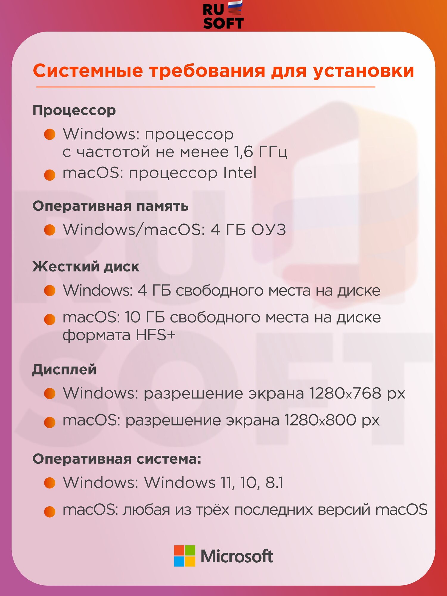 | Состав пакета | Word 365, Excel 365, PowerPoint 365, Outlook 365, OneNote 365, Publisher 365 ,Access 365, OneDrive (5 TB) - Не доступно в РФ. Инструкция, официальный дистрибутив Microsoft |