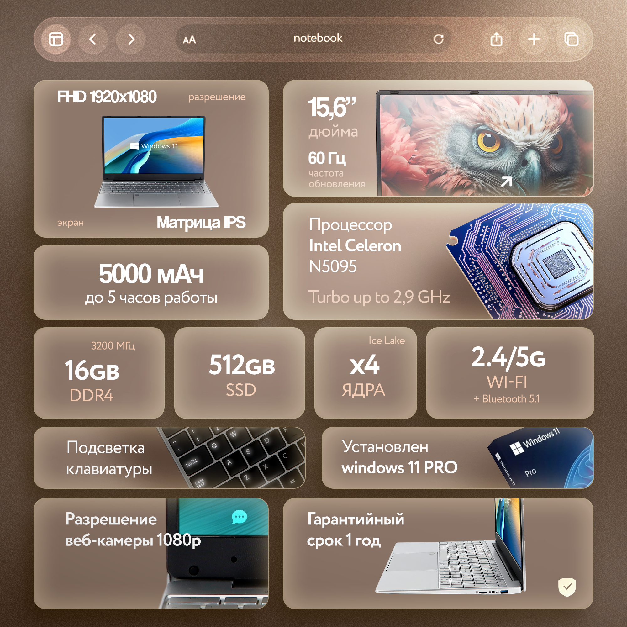 15,6" Ноутбук для работы и учебы, RAM 16 ГБ, SSD 512ГБ, IPS Full HD 1920x1080,Intel N5095, Windows 11, цвет Серый. информация: