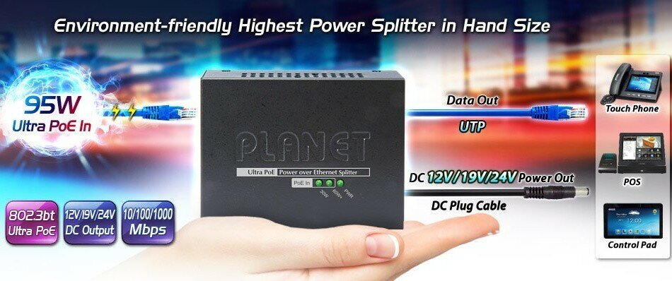 PoE сплиттер/ PLANET Single Port 10/100/1000Mbps 95W Ultra PoE Splitter (12V/19V/24V) информация: