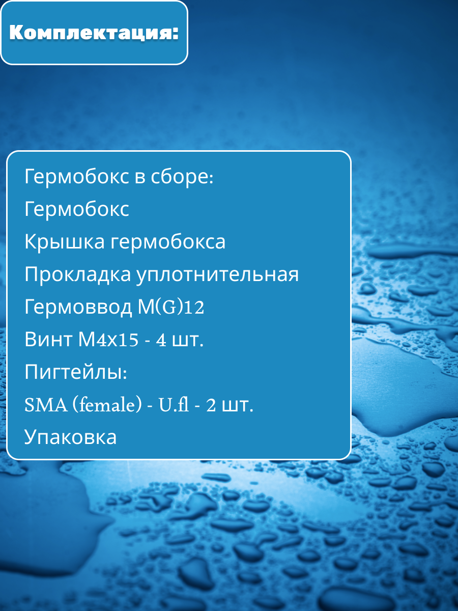 | Комплектация | Гермобокс в сборе: Гермобокс Крышка гермобокса Прокладка уплотнительная Гермоввод М(G)12 Винт М4х15 - 4 шт. Пигтейлы |