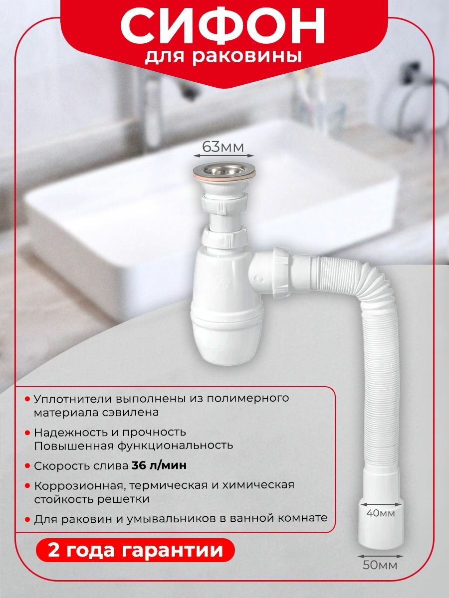 Сифон для раковины WIRQUIN Минор с выпуском и гибким соединением информация:
