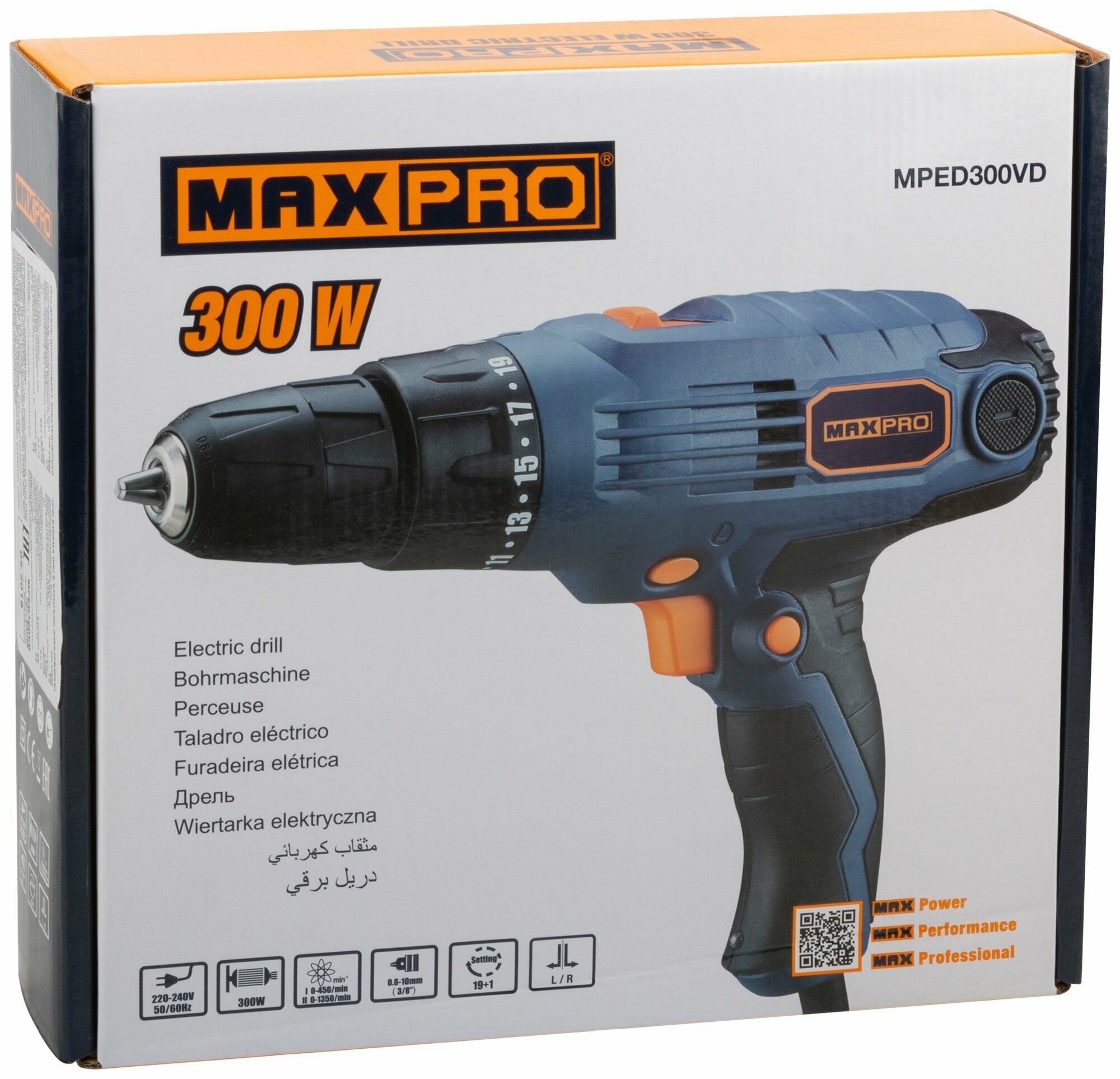MAX-PRO Дрель-Шуруповерт электрическая 300 Вт; 0-450/0-1350об/мин; подсветка ; быстрозажимной патрон 10мм; резиновые вставки; 24,0 Нм; 19+1; 1,1 кг; б информация: