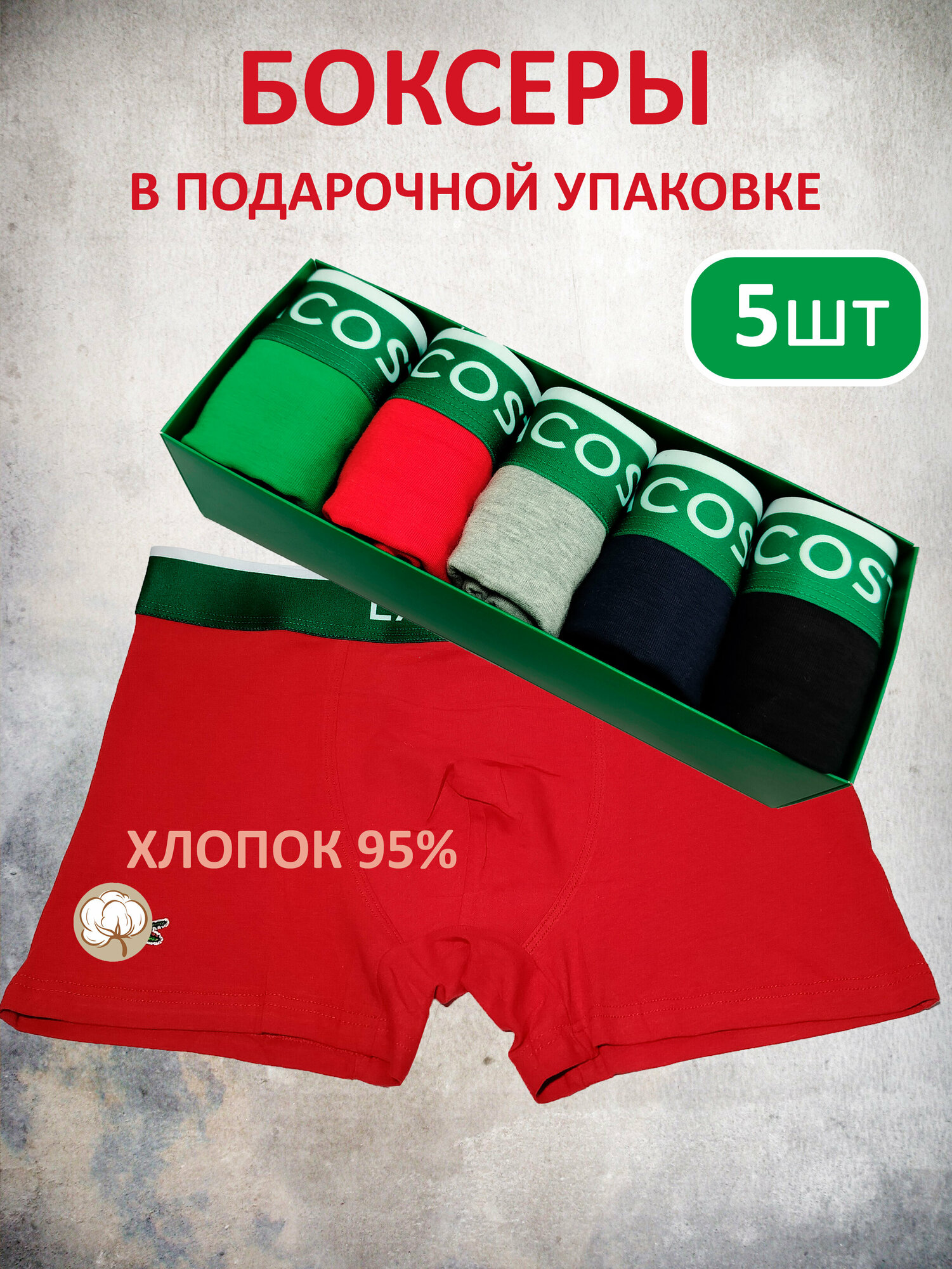 10 цен на Мужские боксеры 5 штук в подарочной коробке, хлопок 95 %, зеленый цвет, размер 52-54 3XL