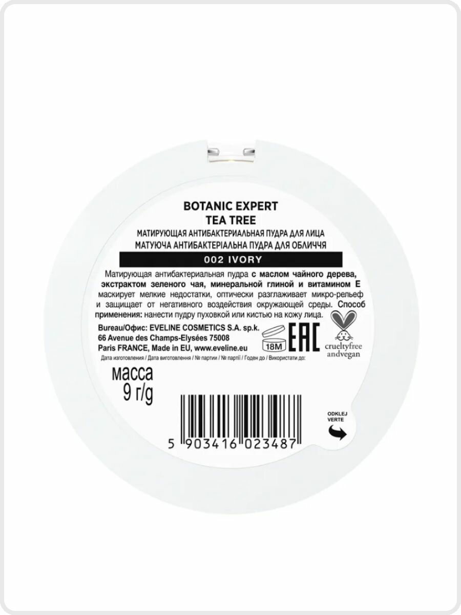 EVELINE Пудра для лица 3в1 BOTANIC EXPERT матирующая антибактериальная №002 - IVORY, 9 гр