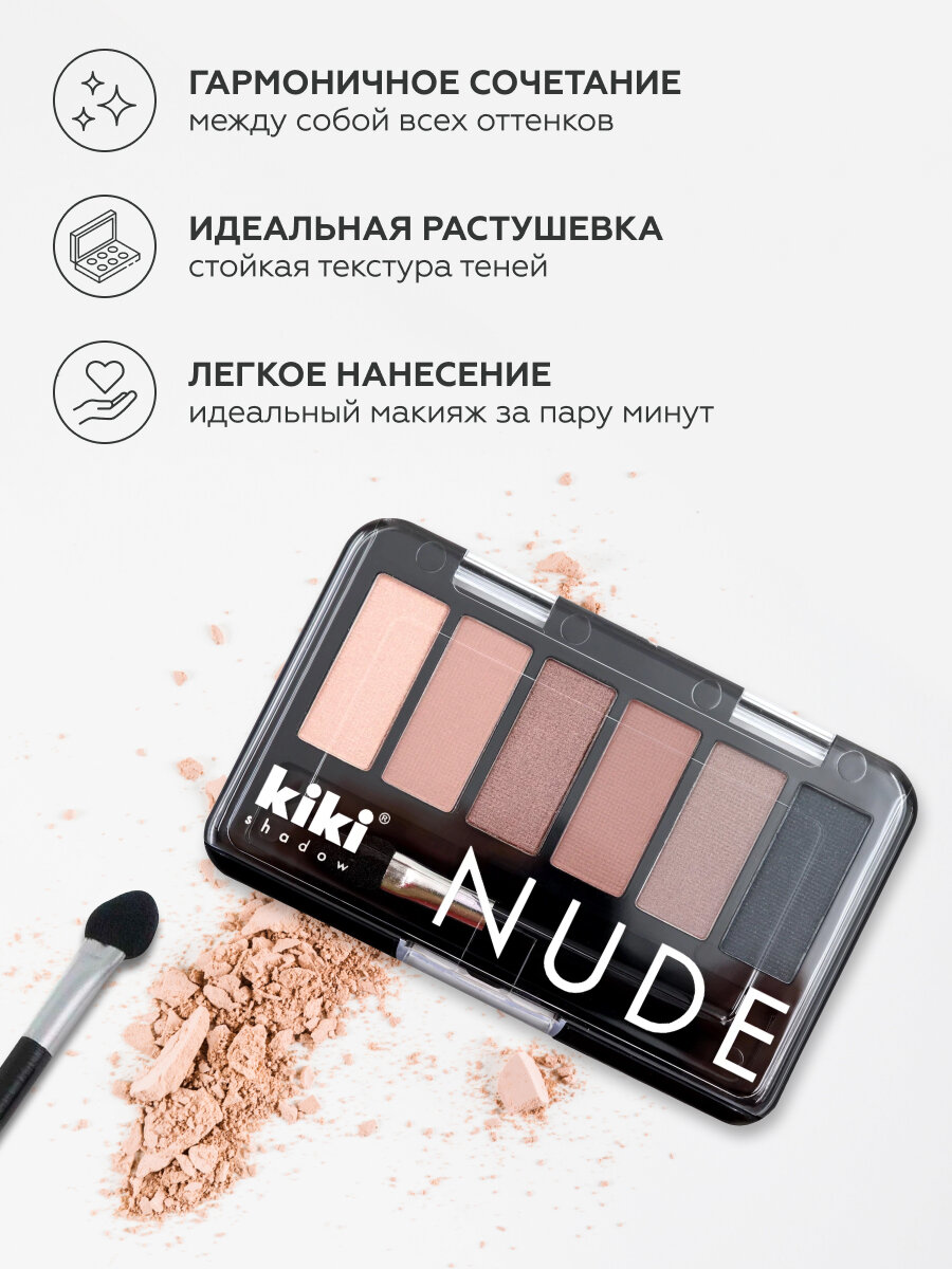 Тени для век kiki shadow NUDE, тон 905 натуральный шик, 6 оттенков, палетка с кистью для растушевки, стойкие, матовые, нюдовые, перламутр 283 ₽