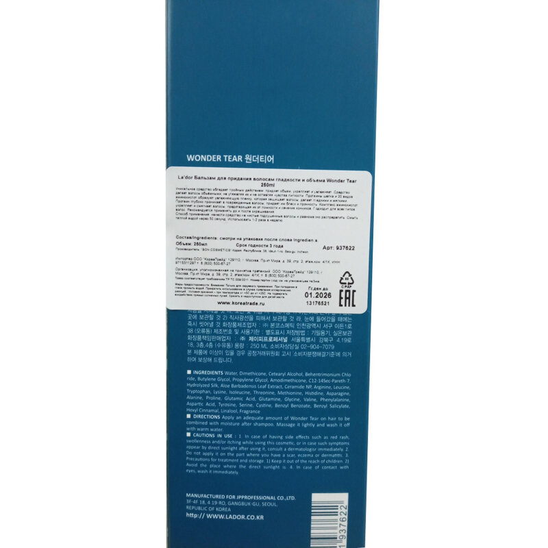 La'dor Wonder Tear Бальзам для придания волосам гладкости и объема 250мл информация: