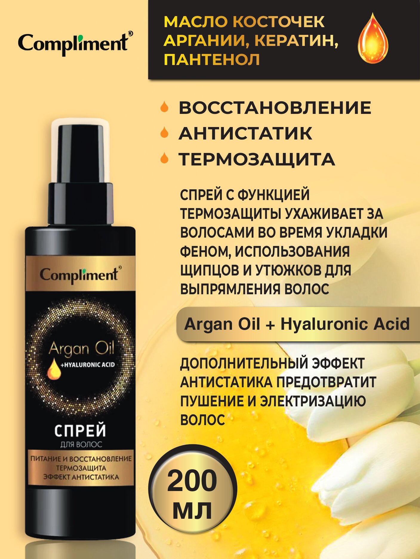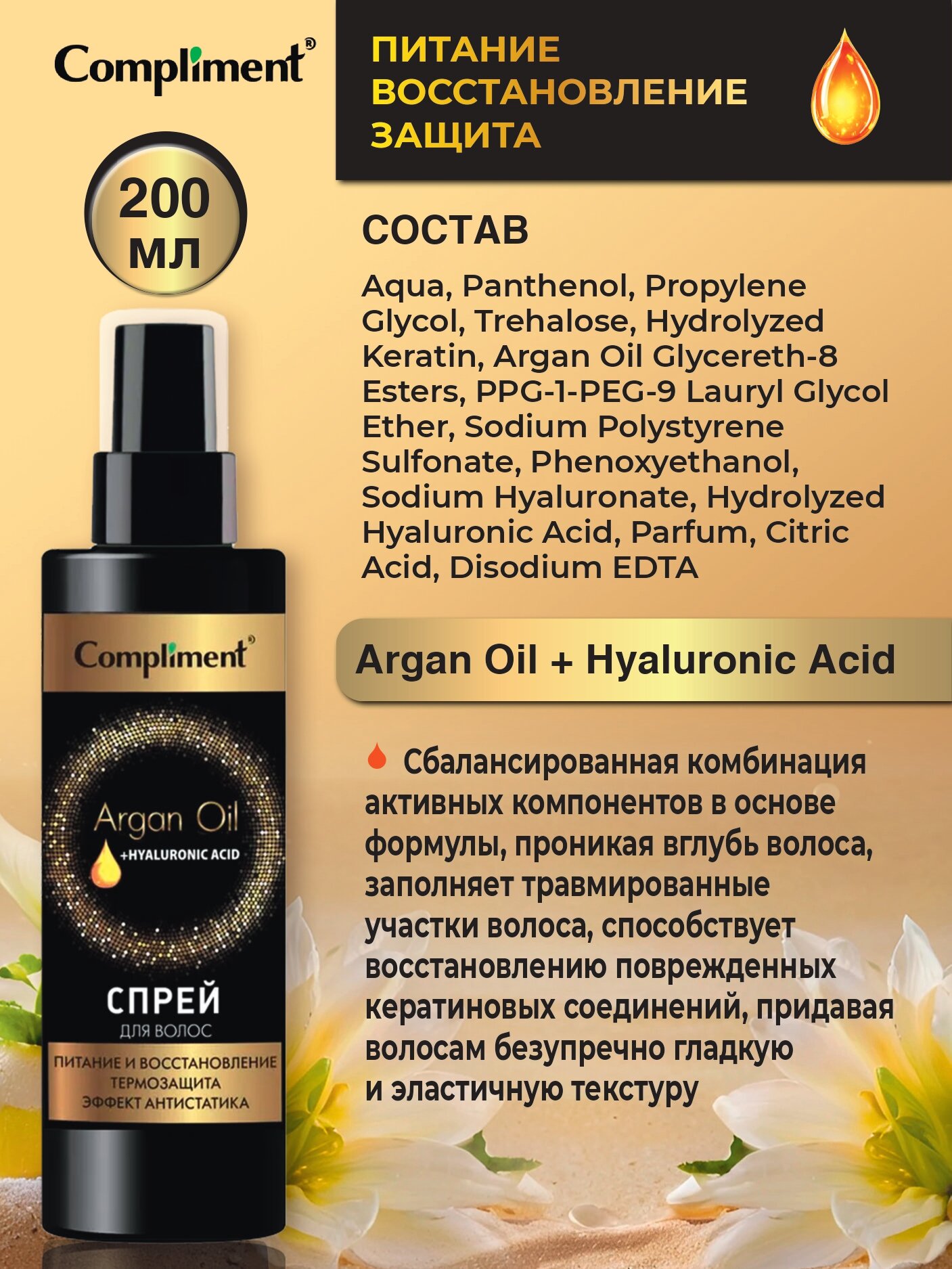Compliment Argan Oil+ Hyaluronic Acid Спрей для волос Питание и восстановление, 200мл информация: