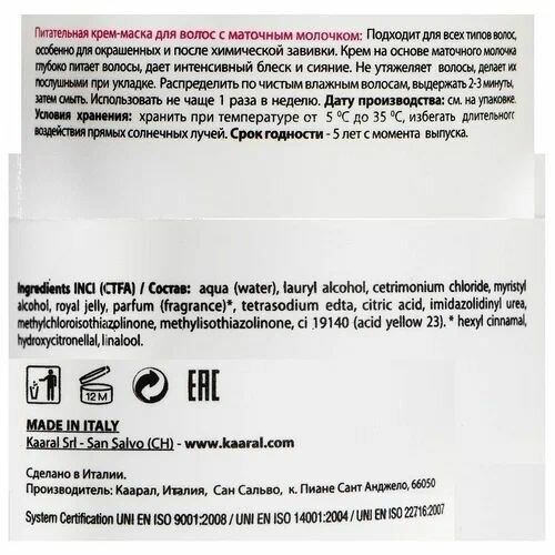 | Дополнительная информация | Интенсивная восстанавливающая маска для волос. Средство имеет мощную специально разработанную формулу на основе маточного молочка, в котором содержится множество питательных компонентов. Маска глубоко питает поврежденные волосы, восстанавливая их структуру. Значительно уменьшает ломкость волос, способствует предотвращению сечения кончиков. Маска препятствует спутыванию волос, делая их гладкими и шелковистыми, облегчает укладку. Придает волосам мягкость и яркий блеск. Облегчает расчесывание волос, уплотняет их и делает их более сильными. Маска не утяжеляет волосы, оставляя их объемными. Не оставляет ощущения жирности или грязи на волосах. |