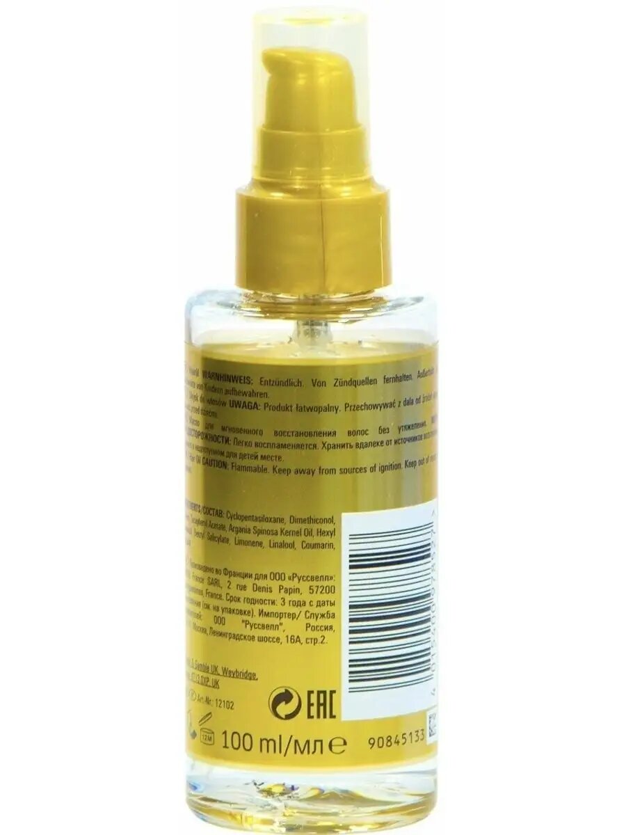 | Состав | cyclopentasiloxane, dimethiconol, alcohol denat, parfum, tocopheryl acetate, argania spinosa kernel oil, hexyl cinnamat, panthenol, benzyl salicylate, limonene, linalool, aqua, prunus armeniaca kernel oil, coumarin, geraniol |