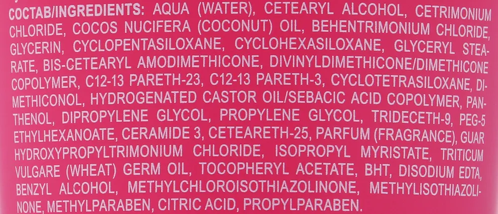 | Состав | вода, цетеариловый спирт, хлорид цетримония, глицерин, масло Cocos Nucifera (кокоса), хлорид бегентримония, дивинилдиметикон / диметикон сополимер, C12-13 парет-23, C12-13 парет-3, циклопентасилоксан, циклотетрасилоксан, диметиконол, бис-цетеарил амодиметикон, глицерилстеарат, циклопентасилоксан, циклогексасилоксан, сопролимер гидрогенизированного касторового масла и себациновой кислоты, пантенол, дипропиленгликоль, пропиленгликоль, тридецет-9, ПЭГ-5 этилгексаноат, церамид 3, цетеарет-25, парфюмерная композиция, хлорид гуаргидроксипропилтримония, изопропилмиристат, масло зародышей Triticum vulgare (пшеницы), токоферилацетат, БГТ, ЭДТА динатрия, бензиловый спирт, метилхлоризотиазолинон, метилизотиазолинон, метилпарабен, кислота лимонная, пропилпарабен |