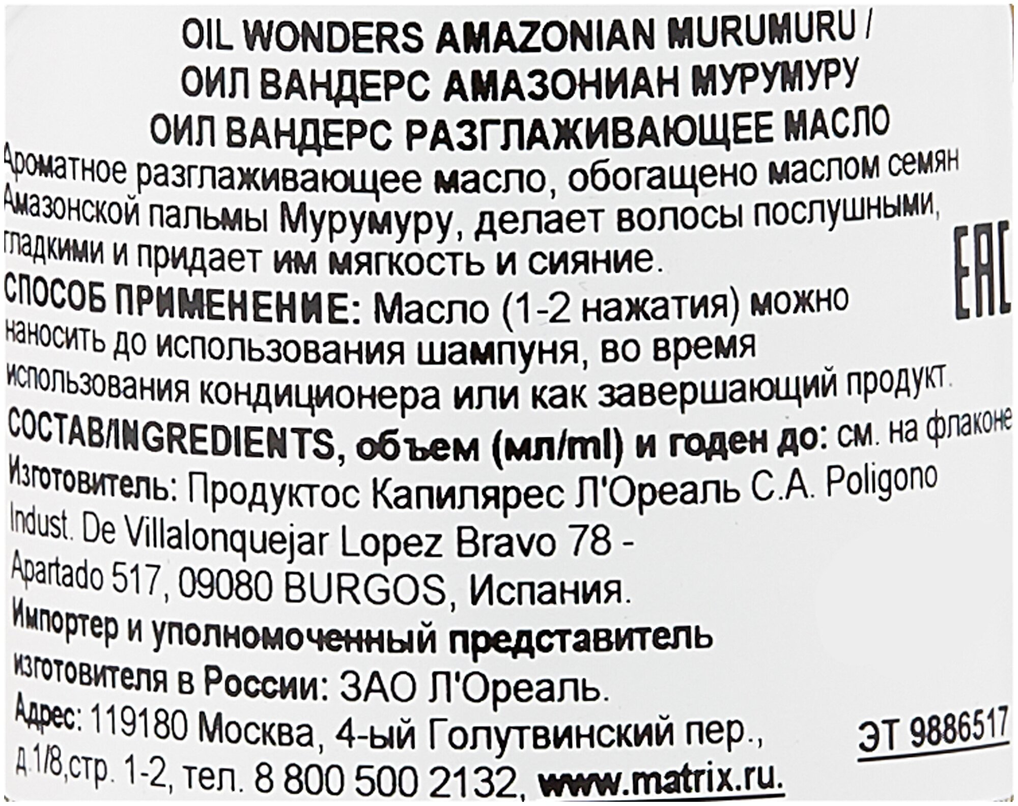 | Комплектация | Matrix Масло для волос разглаживающее с маслом Мурумуру Oil Wonders, 150 мл - 1ед. |