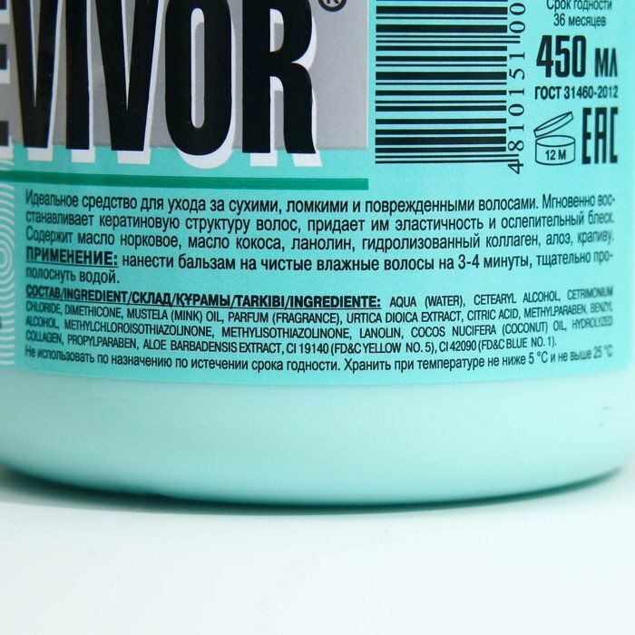 | Состав | вода, цетеариловый спирт, хлорид цетримония, диметикон, парфюмерная композиция, норковое масло, экстракт Urtica Dioica (крапивы), кислота лимонная, метилпарабен, бензиловый спирт, метилхлоризотиазолинон, метилизотиазолинон, гидролизованный коллаген, ланолин, масло Cocos Nucifera (кокоса), пропилпарабен, экстракт Aloe Barbadensis (алоэ), краситель зелёный |