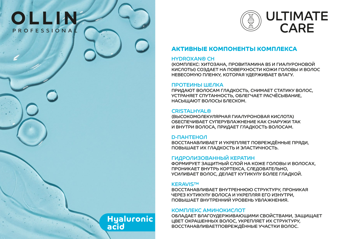 | Активный ингредиент | гиалуроновая кислота / кератин / пантенол / протеины / протеины шелка |