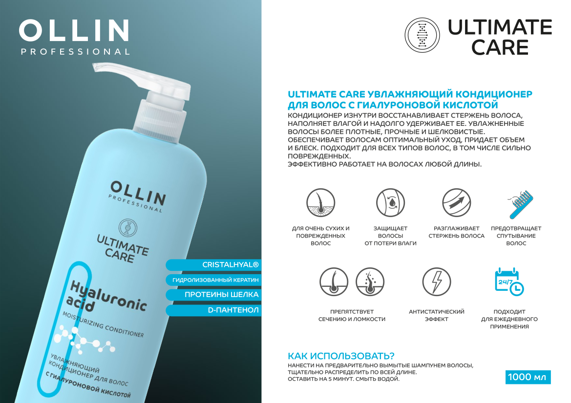 OLLIN Professional Кондиционер Ultimate Care с гиалуроновой кислотой увлажняющий для поврежденных волос, 1000 мл информация: