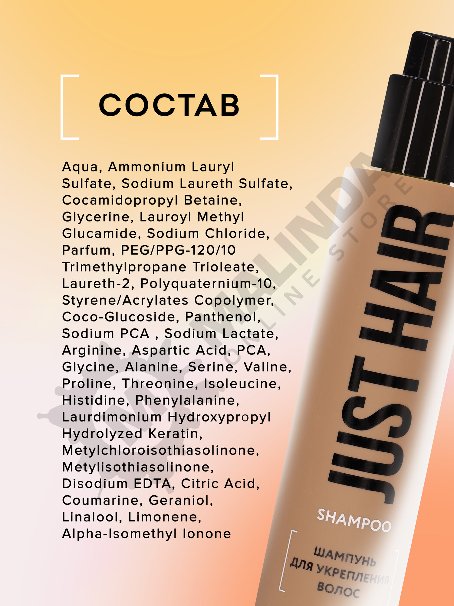| Состав | Aqua, Ammonium Lauryl Sulfate, Sodium Laureth Sulfate, Cocamidopropyl Betaine, Glycerine, Lauroyl Methyl Glucamide, Sodium Chloride, Parfum, PEG/PPG-120/10 Trimethylpropane Trioleate, Laureth-2, Polyquaternium-10, Styrene/Acrylates Copolymer, Coco-Glucoside, Panthenol, Sodium PCA , Sodium Lactate, Arginine, Aspartic Acid, PCA, Glycine, Alanine, Serine, Valine, Proline, Threonine, Isoleucine, Histidine, Phenylalanine, Laurdimonium Hydroxypropyl Hydrolyzed Keratin, Metylchloroisothiasolinone, Metylisothiasolinone, Disodium EDTA, Citric Acid, Coumarine, Geraniol, Linalool, Limonene, Alpha-Isomethyl Ionone. |