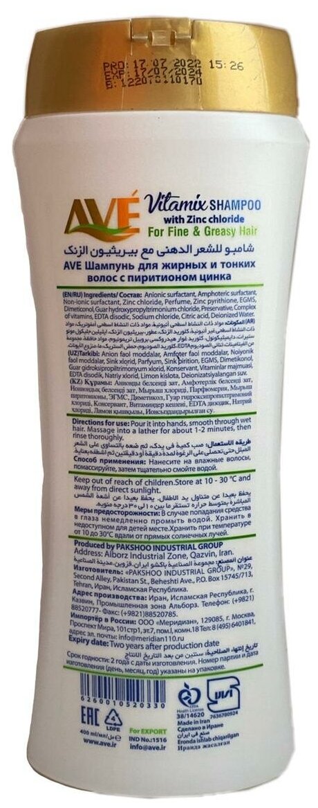 Шампунь AVE для жирных и тонких волос с пиритионом цинка, 400мл информация: