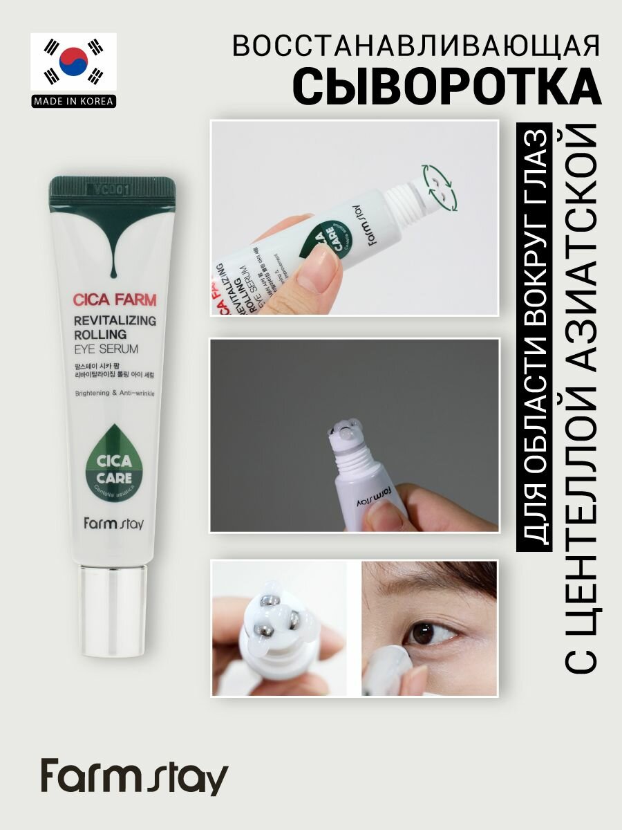 FarmStay Восстанавливающая роллер сыворотка для кожи вокруг глаз для век с центеллой азиатской, Корея. Cica Farm Revitalizing Rolling Eye Serum, 25ml. Уходовая корейская косметика информация: