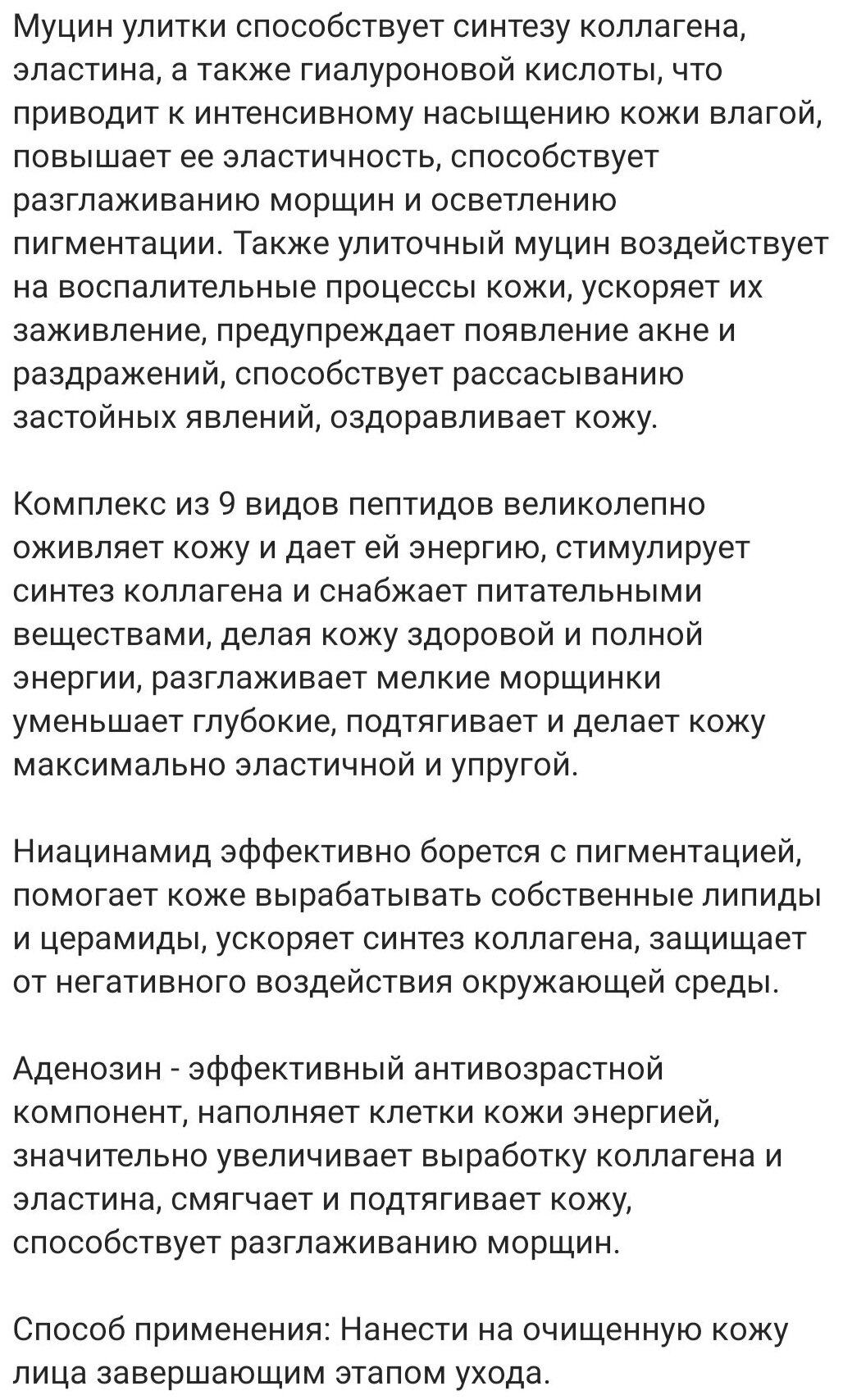 | Активный ингредиент | аденозин / антиоксиданты / витамин B3 (ниацинамид) / гиалуроновая кислота / коллаген / липиды / муцин улитки / пантенол (провитамин B5) / пептиды / церамиды / эластин |