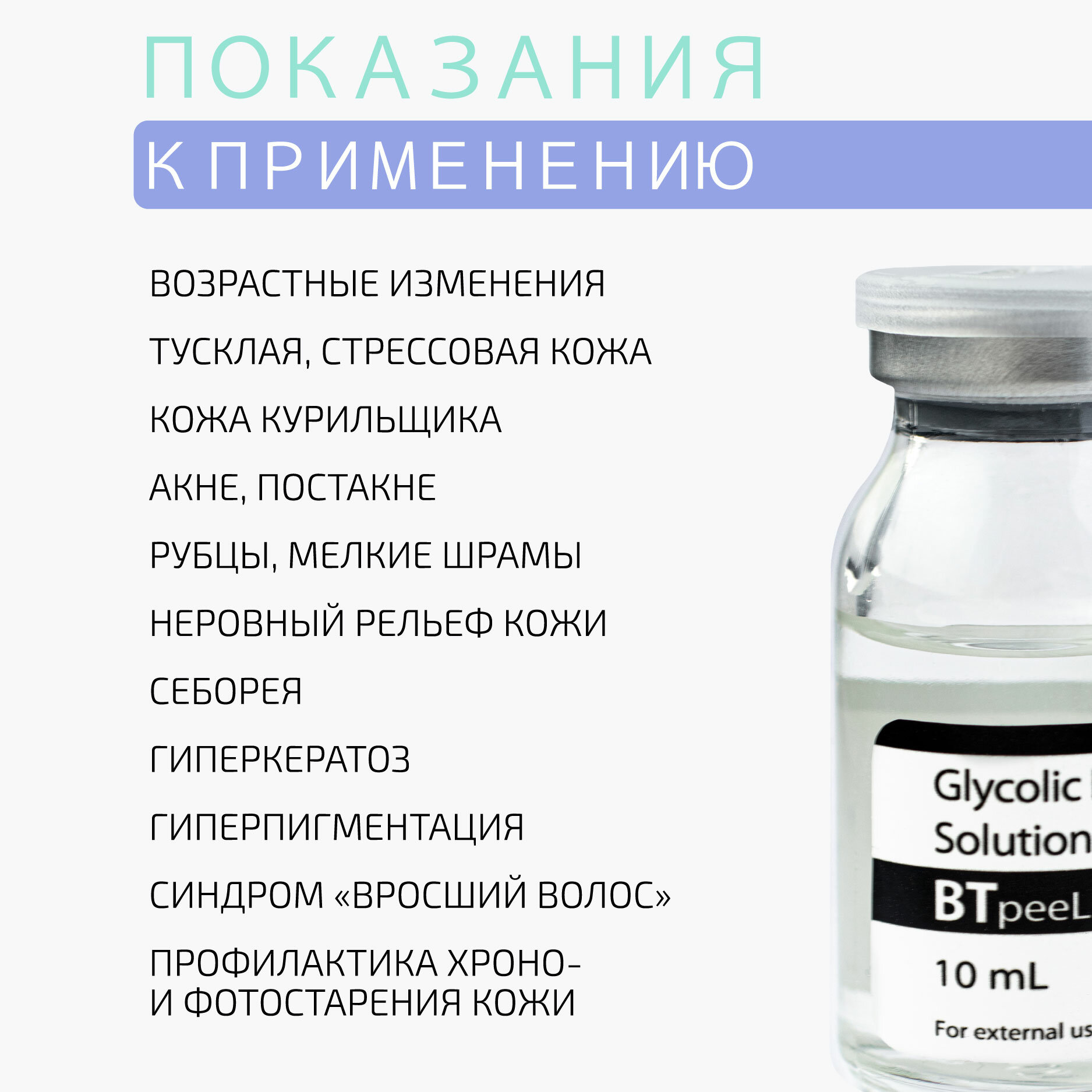 | Дополнительная информация | гликолевый пилинг BTpeel имеет очень низкий pH (=1,9), необходимо использовать нейтрализатор для завершения процедуры, избегать попадания в глаза |