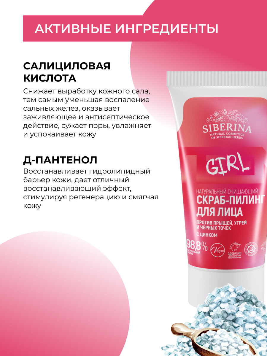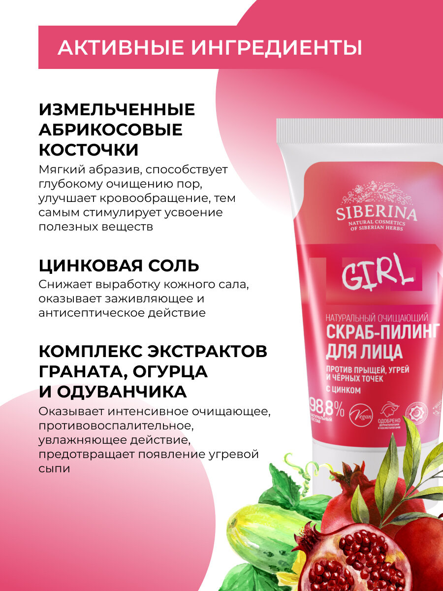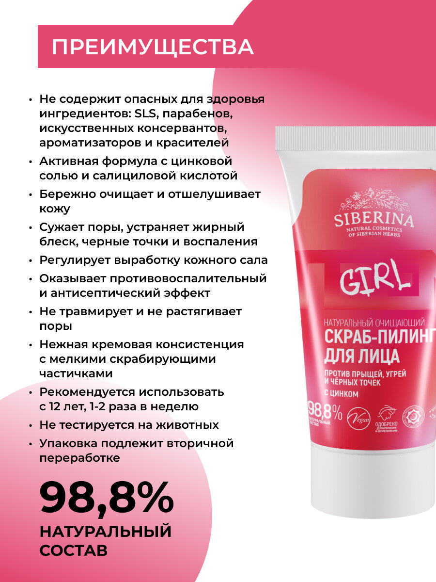 Siberina Натуральный очищающий скраб-пилинг для лица против прыщей, угрей и чёрных точек с цинком, 50 мл информация: