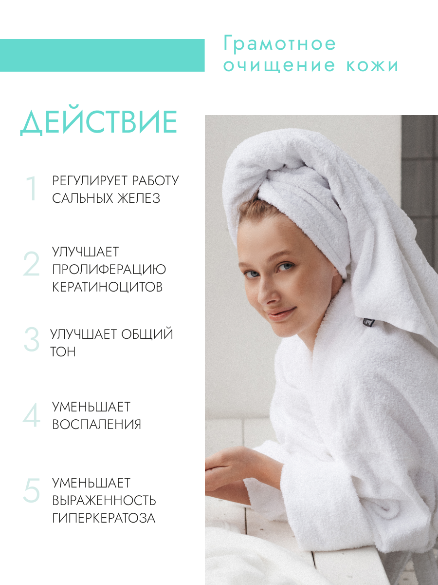 | Дополнительная информация | активные компоненты: - лецитин - оказывает смягчающее и тонизирующее действие. Благодаря выраженному поверхностно-активным свойствам способствует более глубокому проникновению жировых веществ в эпидермис. Обладает эмульгирующими, стабилизирующими и загущающими свойствами; - растительный энзимно-кислотный комплекс деликатно удаляет роговые чешуйки и белковые загрязнения с поверхности кожи, выравнивает текстуру кожи, делает ее нежной, гладкой и мягкой улучшает цвет лица и придает коже естественное сияние; - дрожжевой гидролизат - улучшает общее состояние кожи, разглаживает и выравнивает ее, делает упругой и эластичной, убирает мелкие морщинки и освежает. Обладает ранозаживляющим и успокаивающим действием, удерживает влагу в глубоких слоях кожи. Оказывает регенерирующий эффект |