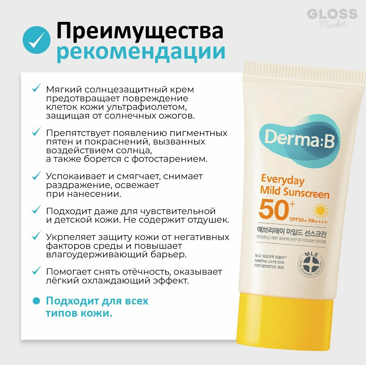 Derma:B Мягкий солнцезащитный крем на каждый день Everyday Mild Sunscreen SPF50+ PA++ 50 мл информация: