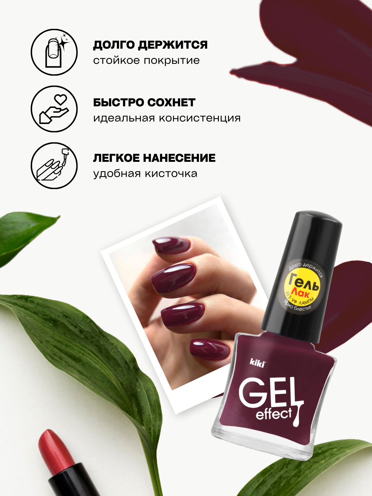 Лак для ногтей kiki Gel Effect тон 19 вишневый с гелевым эффектом без уф-лампы, глянцевый маникюр и педикюр, 6 мл 201 ₽