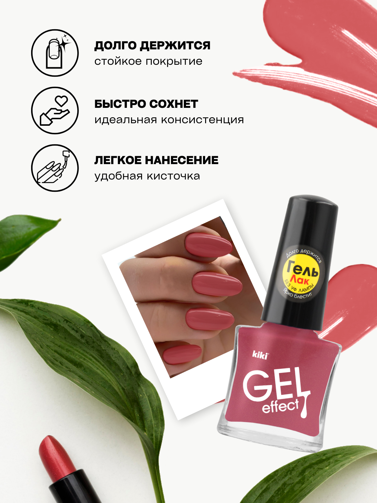 Лак для ногтей kiki Gel Effect тон 26 темно-коралловый с гелевым эффектом без уф-лампы, цветной глянцевый маникюр и педикюр, кики, 6 мл 159 ₽
