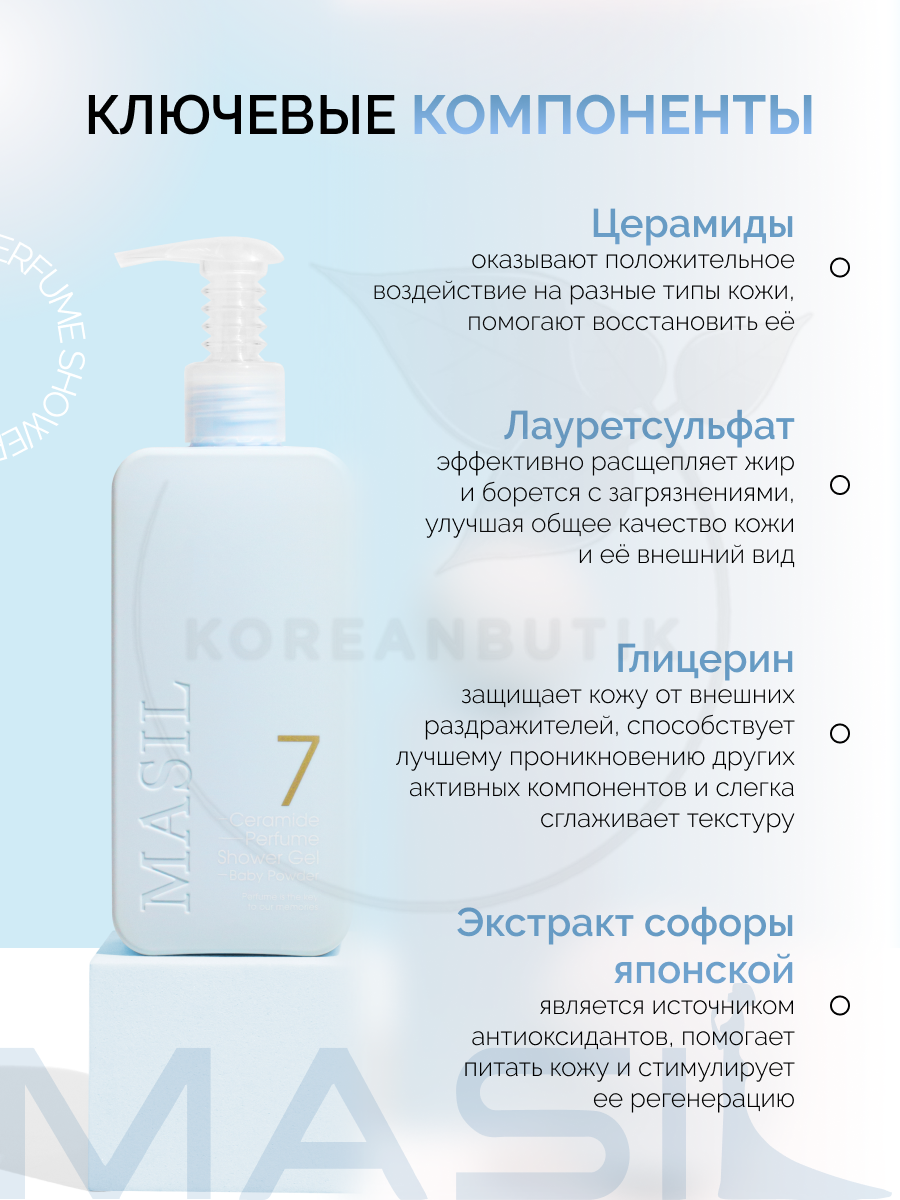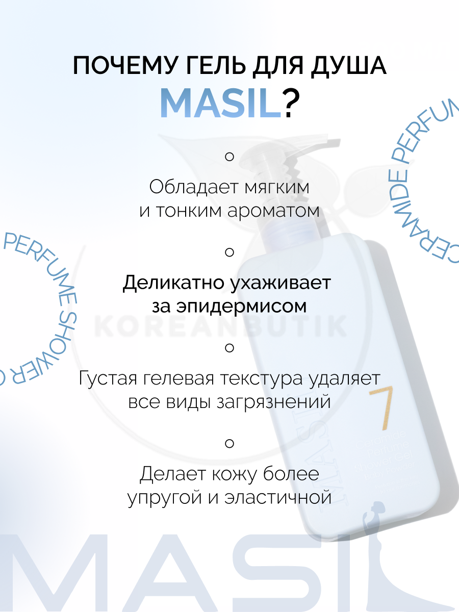 10 цен на MASIL 7 CERAMIDE PERFUME SHOWER GEL Парфюмированный гель для душа с керамидами и ароматом детской присыпки