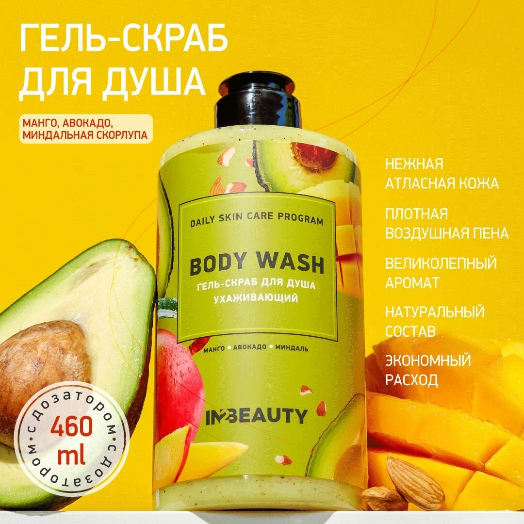 10 цен на IN2BEAUTY/ гель скраб для душа и тела: с маслом авокадо, манго, миндаль, ухаживающий спа, мужской и женский, 460мл