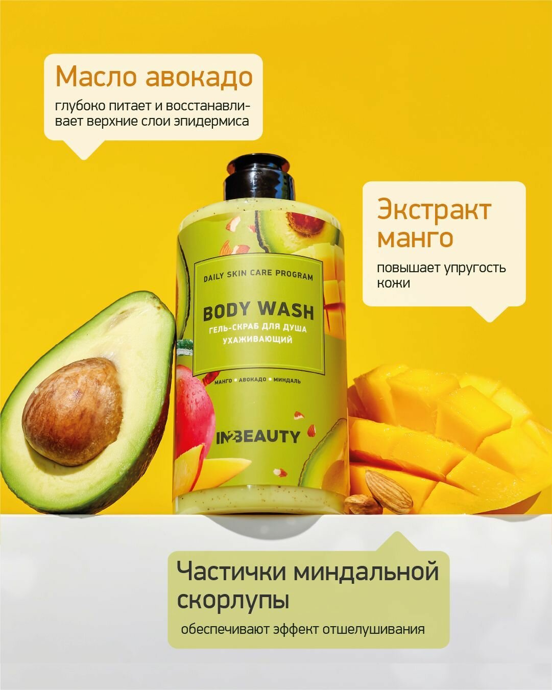 IN2BEAUTY/ гель скраб для душа и тела: с маслом авокадо, манго, миндаль, ухаживающий спа, мужской и женский, 460мл