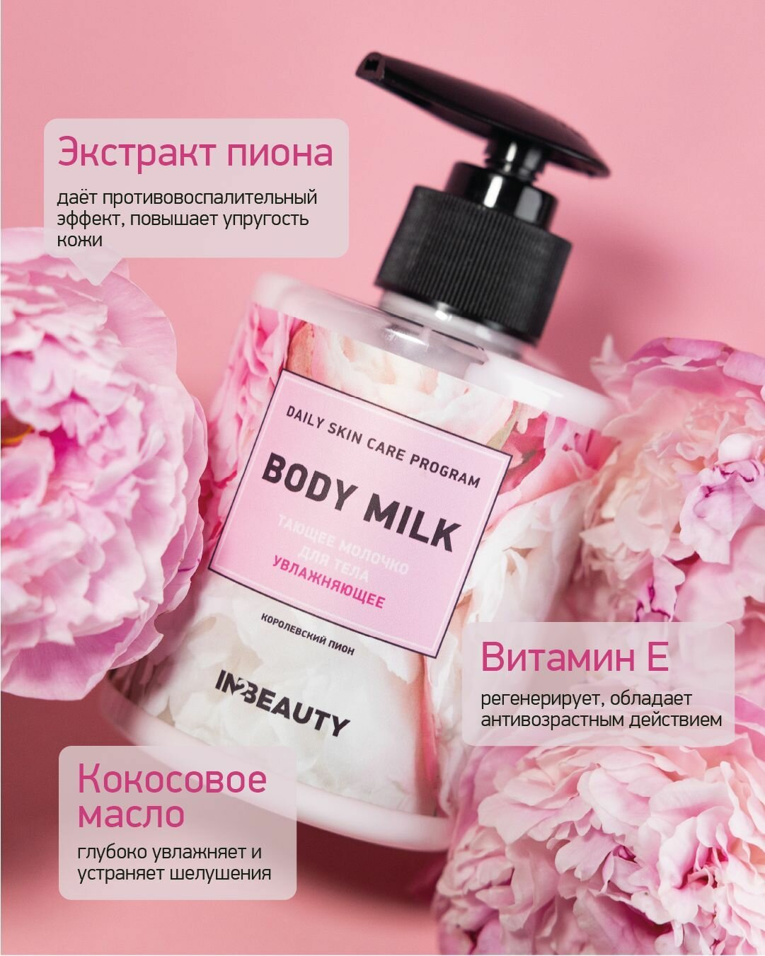 IN2BEAUTY/ гель для душа увлажняющий с маслами персика и нектарина + молочко для тела увлажняющее королевский пион с витамином C и E, с дозатором информация: