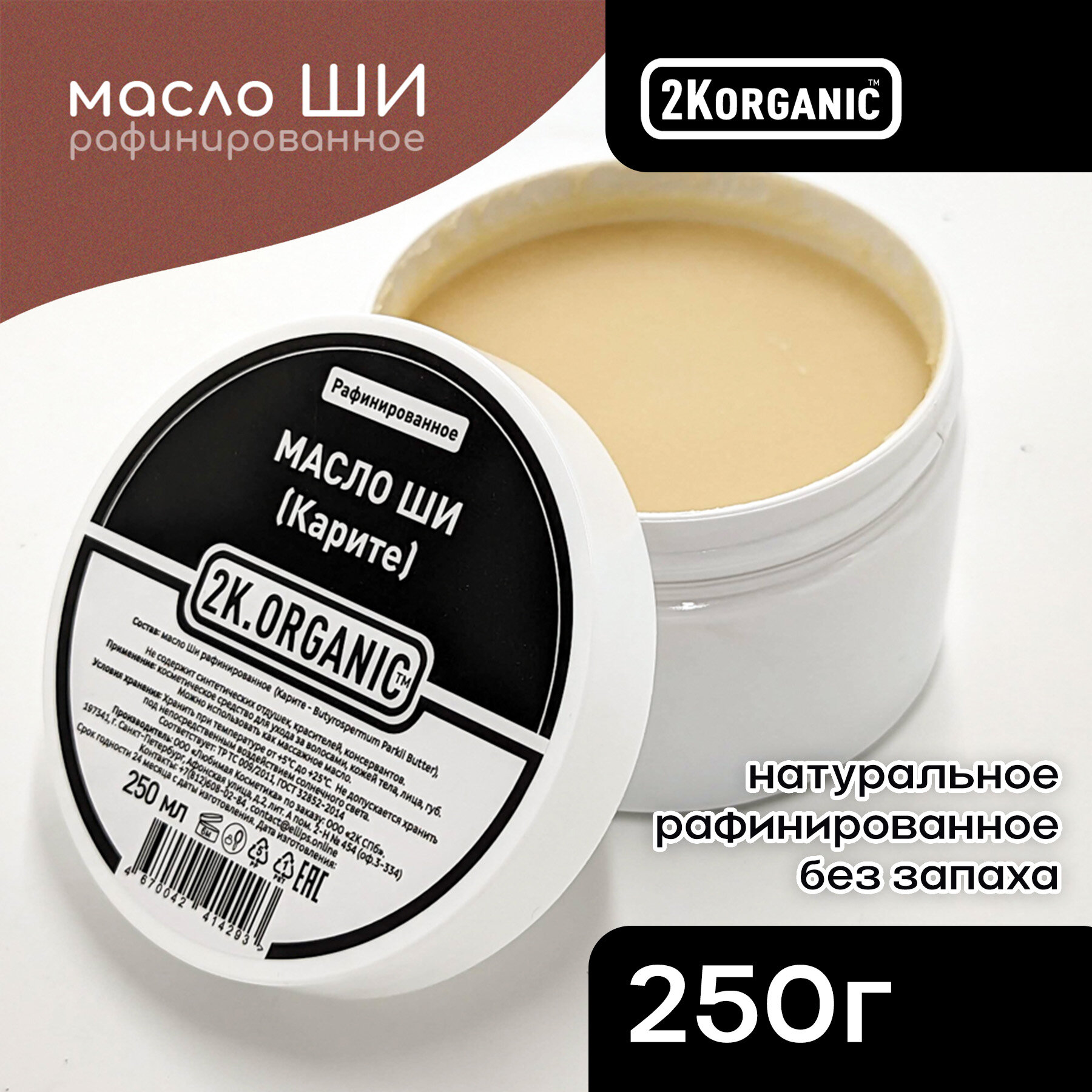 2K.ORGANIC Масло Ши (Карите) рафинированное, 100% натуральное. 250мл. Для ухода за волосами, кожей тела, лица, губ, массажное масло. информация: