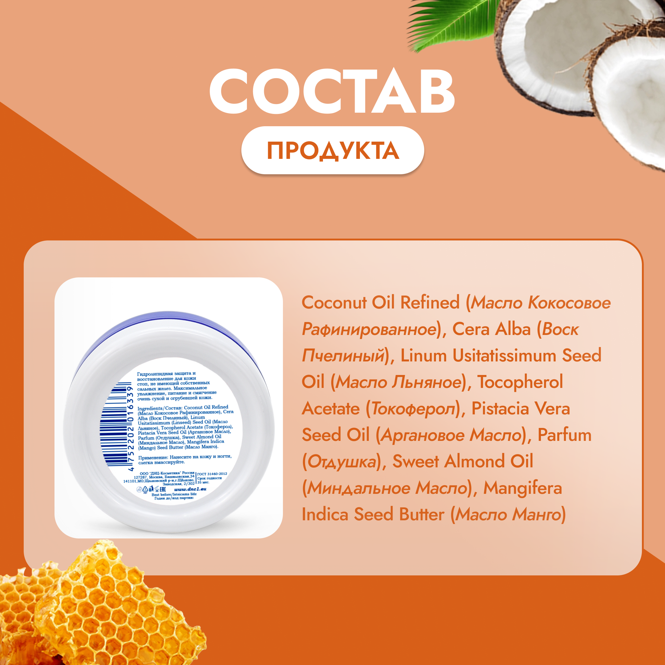 | Состав | Coconut Oil Refined (Масло Кокосовое Рафинированное), Cera Alba (Воск Пчелиный), Linum Usitatissimum (Linseed) Seed Oil (Масло Льняное), Tocopherol Acetate (Токоферол), Pistacia Vera Seed Oil (Аргановое Масло), Parfum (Отдушка), Sweet Almond Oil (Миндальное Масло), Mangifera Indica (Mango) Seed Butter (Масло Манго). |