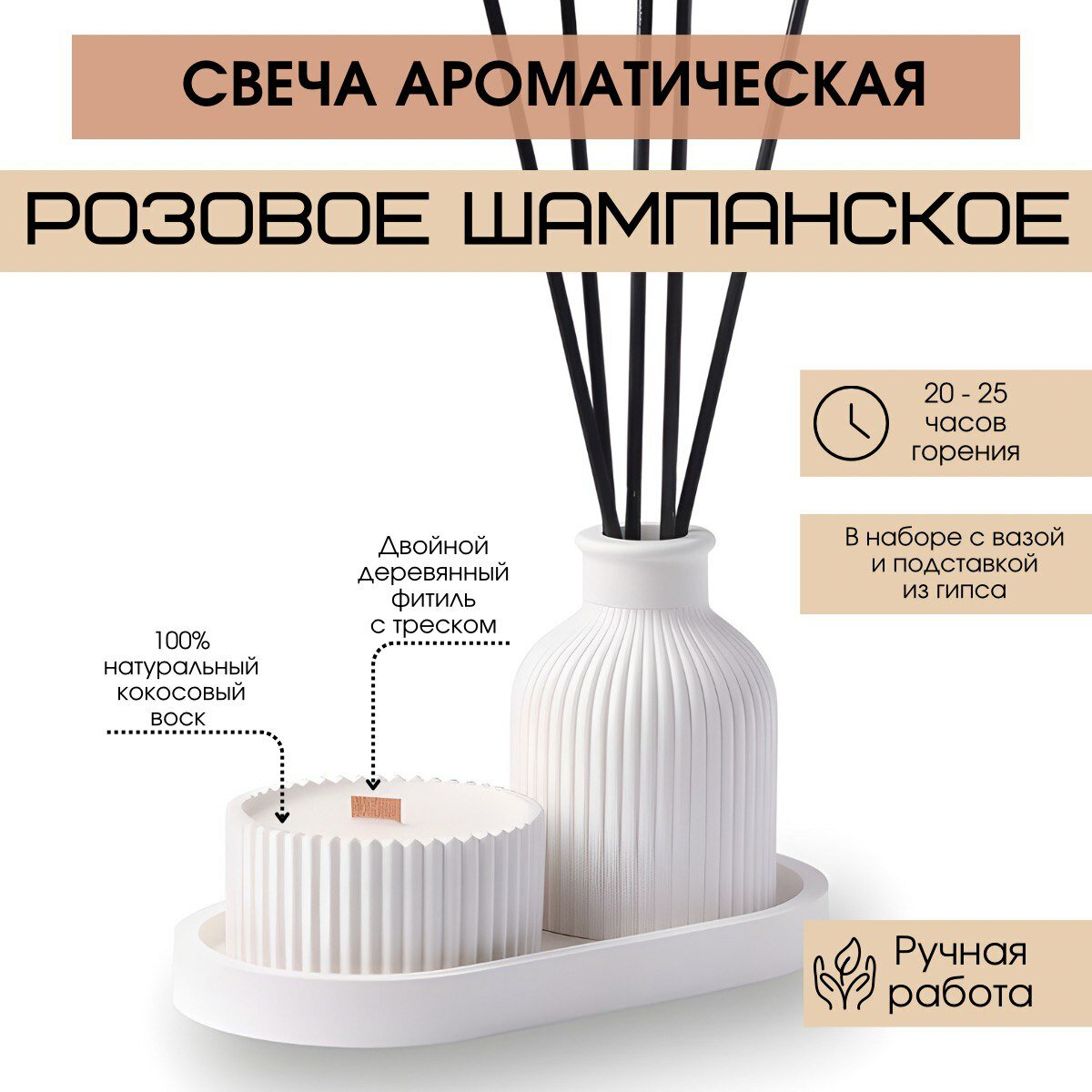 Отзывы на Свеча ароматическая ,,Розовое шампанское,, из кокосового воска в гипсовом подсвечнике, набор из гипса