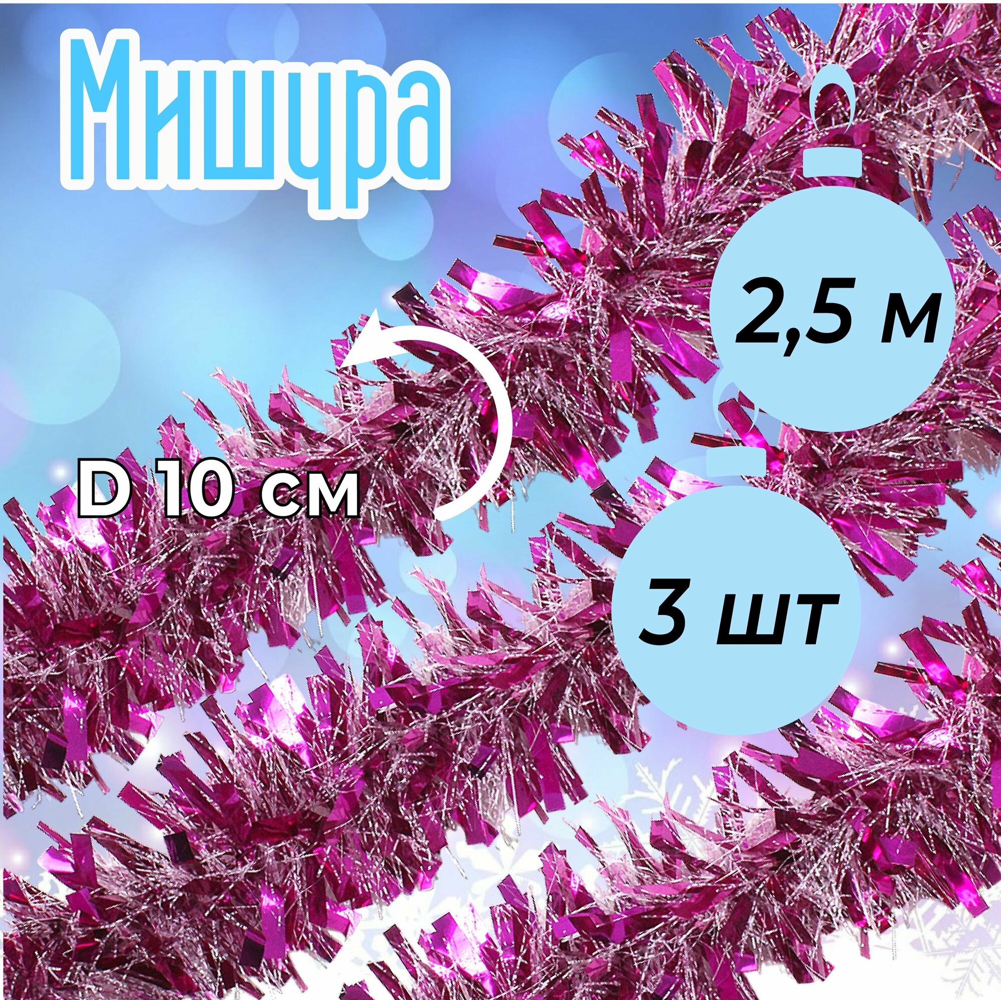 10 цен на Новогодняя мишура (3 шт.) E-14 блестящая розовая с белым, длина 2.5 метра, ширина 10 см.