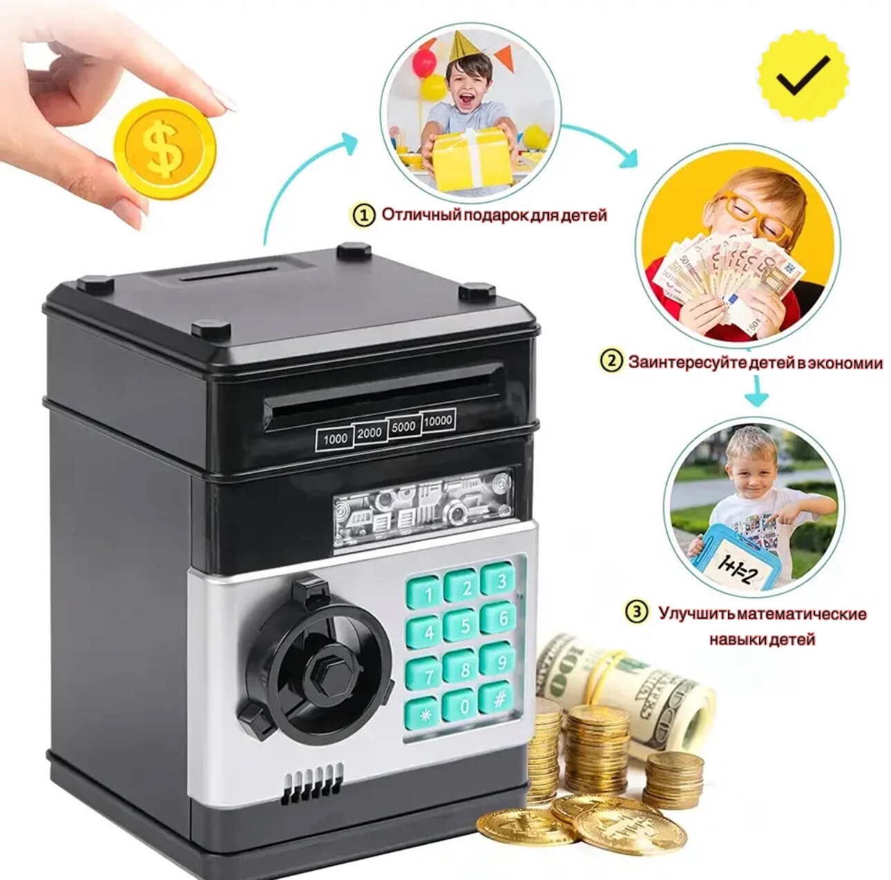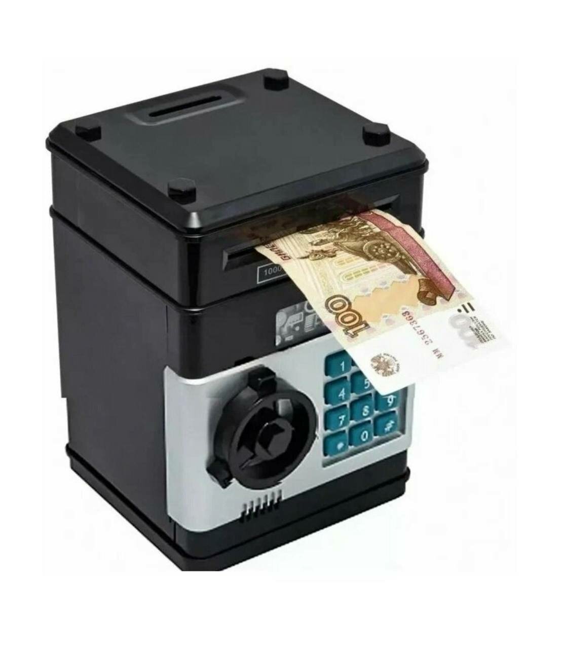 Отзывы на Копилка-сейф для денег /Электронный банкомат с купюроприемником и кодовым замком/ На батарейках/Сейф копилка электронная/Детская/ Черный/19х19х13.5см