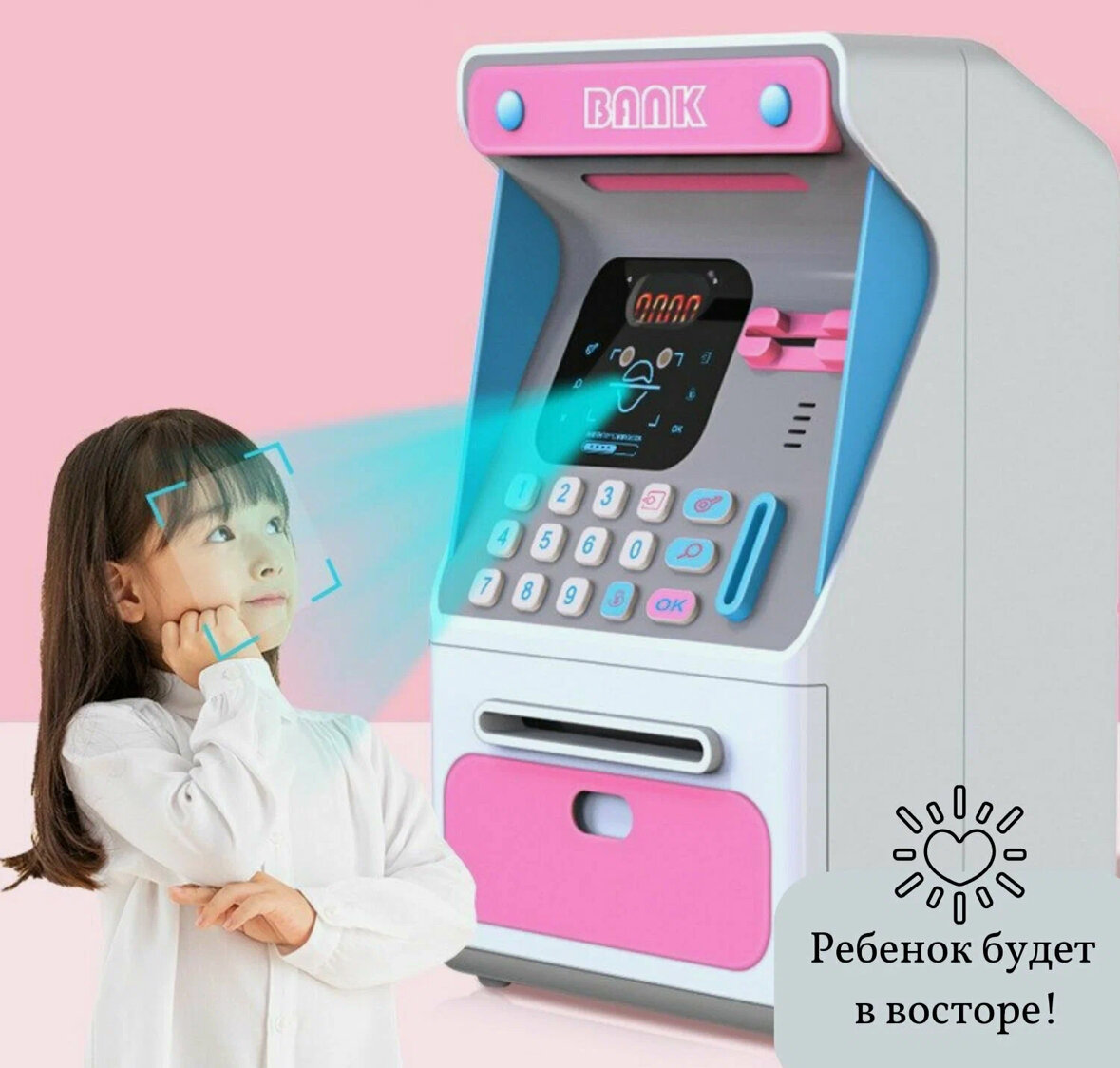 Отзывы на Интерактивная копилка-банкомат с распознованием лица для купюр и монет, розовая.
