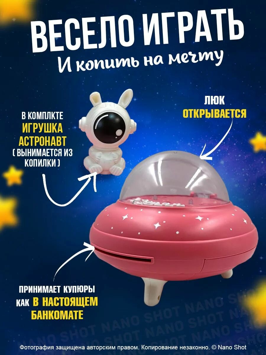 Интерактивная музыкальная электронная копилка-сейф Летающая тарелка НЛО с распознованием лица, с купюроприёмником и с кодовым замком, розовая информация: