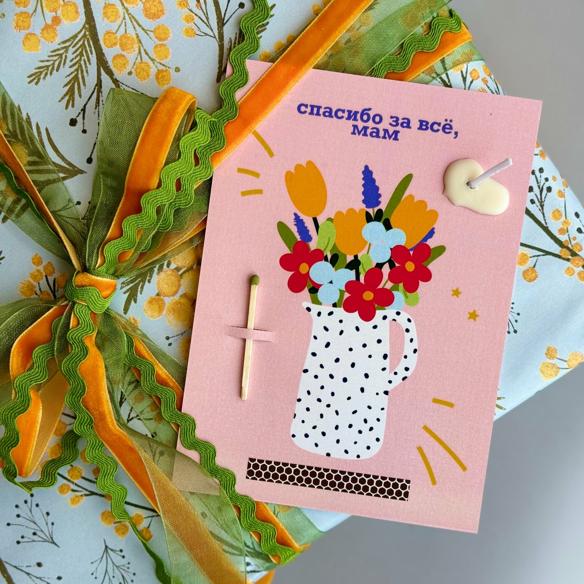 Открытка свечка "Спасибо, мам", от Вьюнчик, 14,8х10,5 см (А6), стильная поздравительная открытка маме 359 ₽