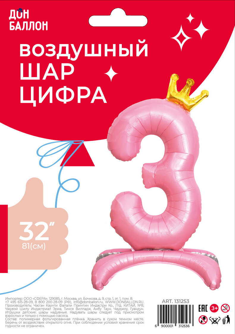 Отзывы на Шар (32''/81 см) Цифра, 3 Золотая корона, на подставке, Розовый, 1 шт. в упак.