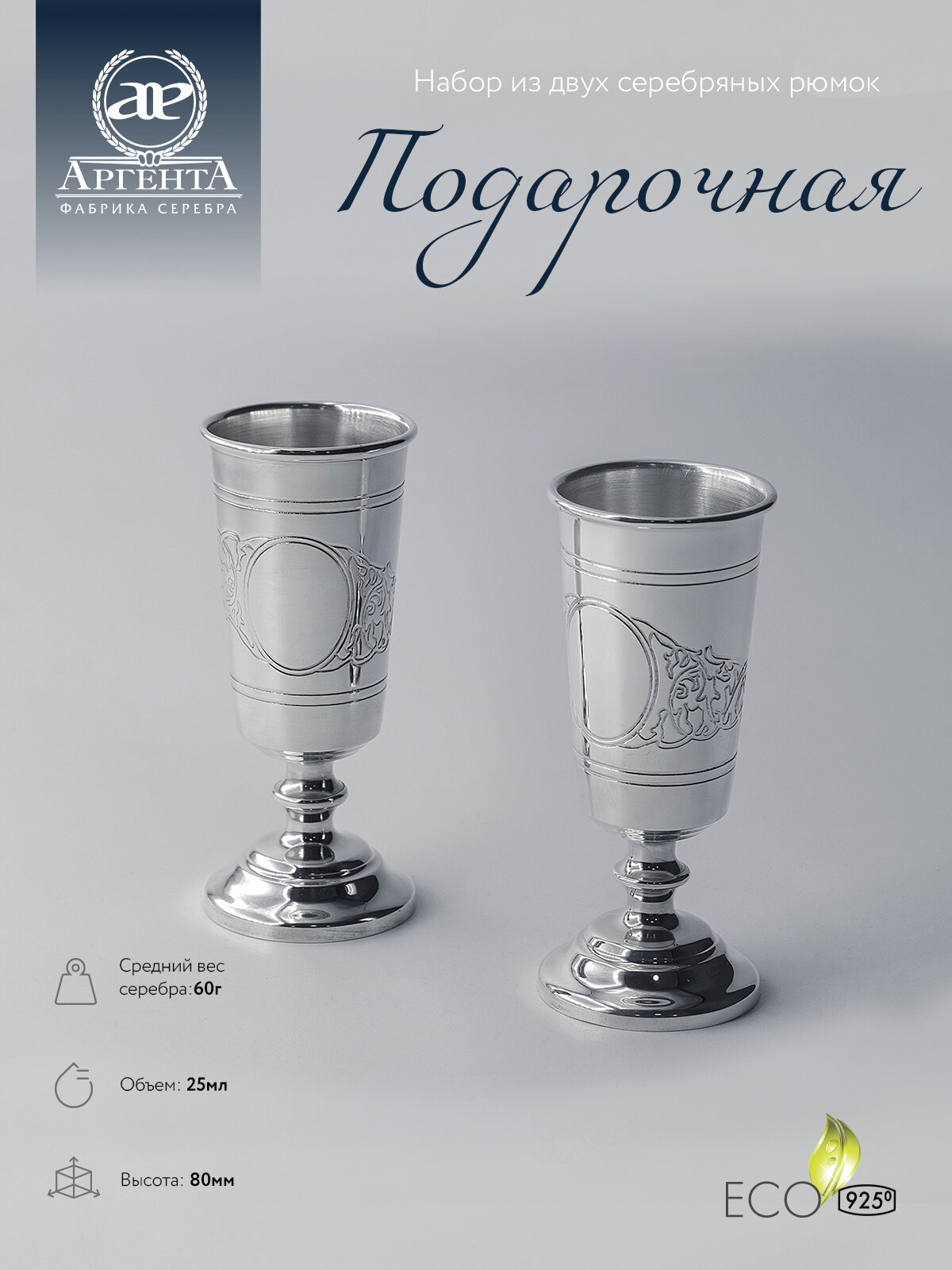 Набор серебряных рюмок "Подарочная" (2 пр.) в футляре информация: