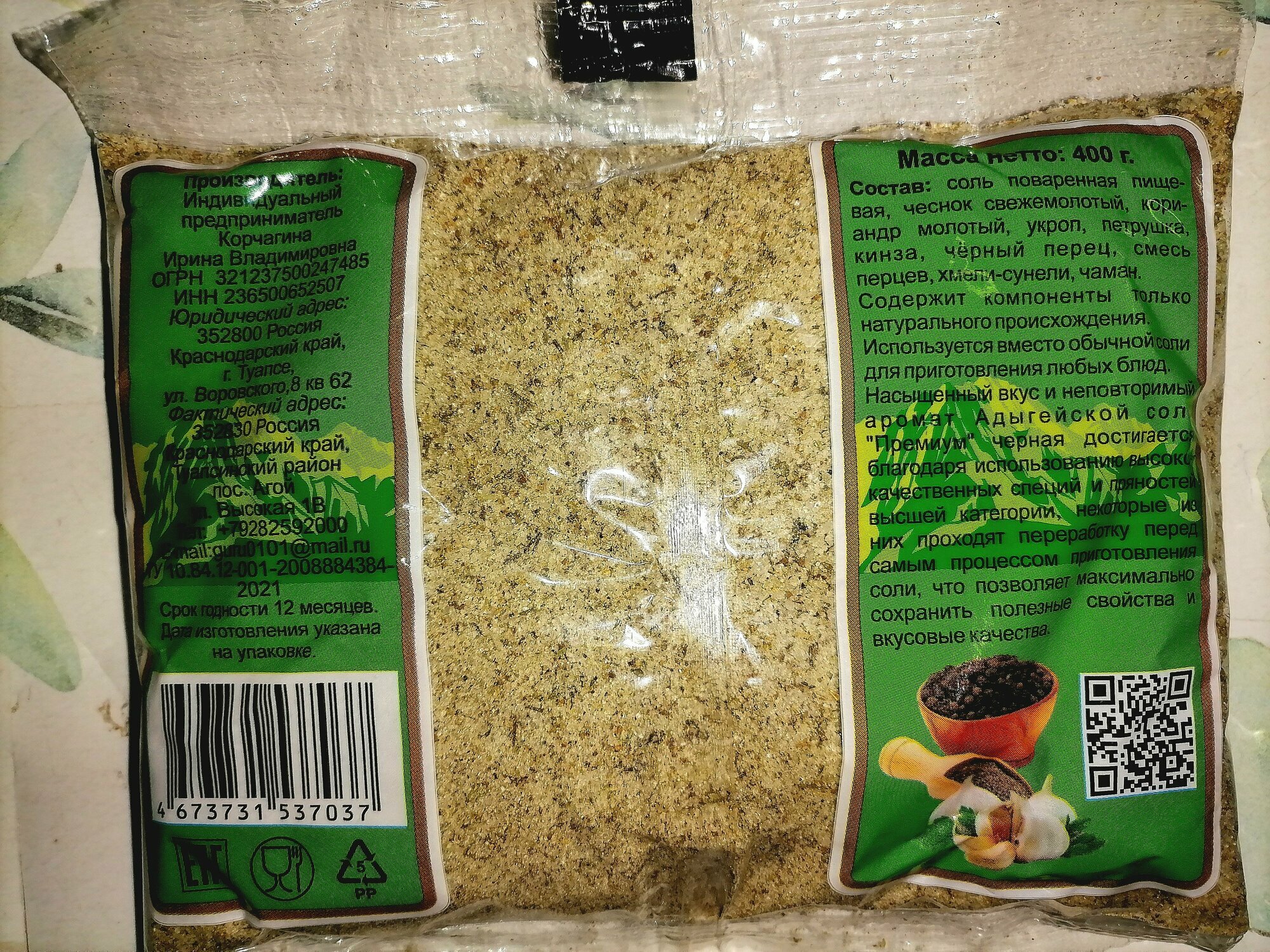 | Состав | Соль поваренная пищевая , чеснок, кориандр, перец черный, чабер,укроп,петрушка. |