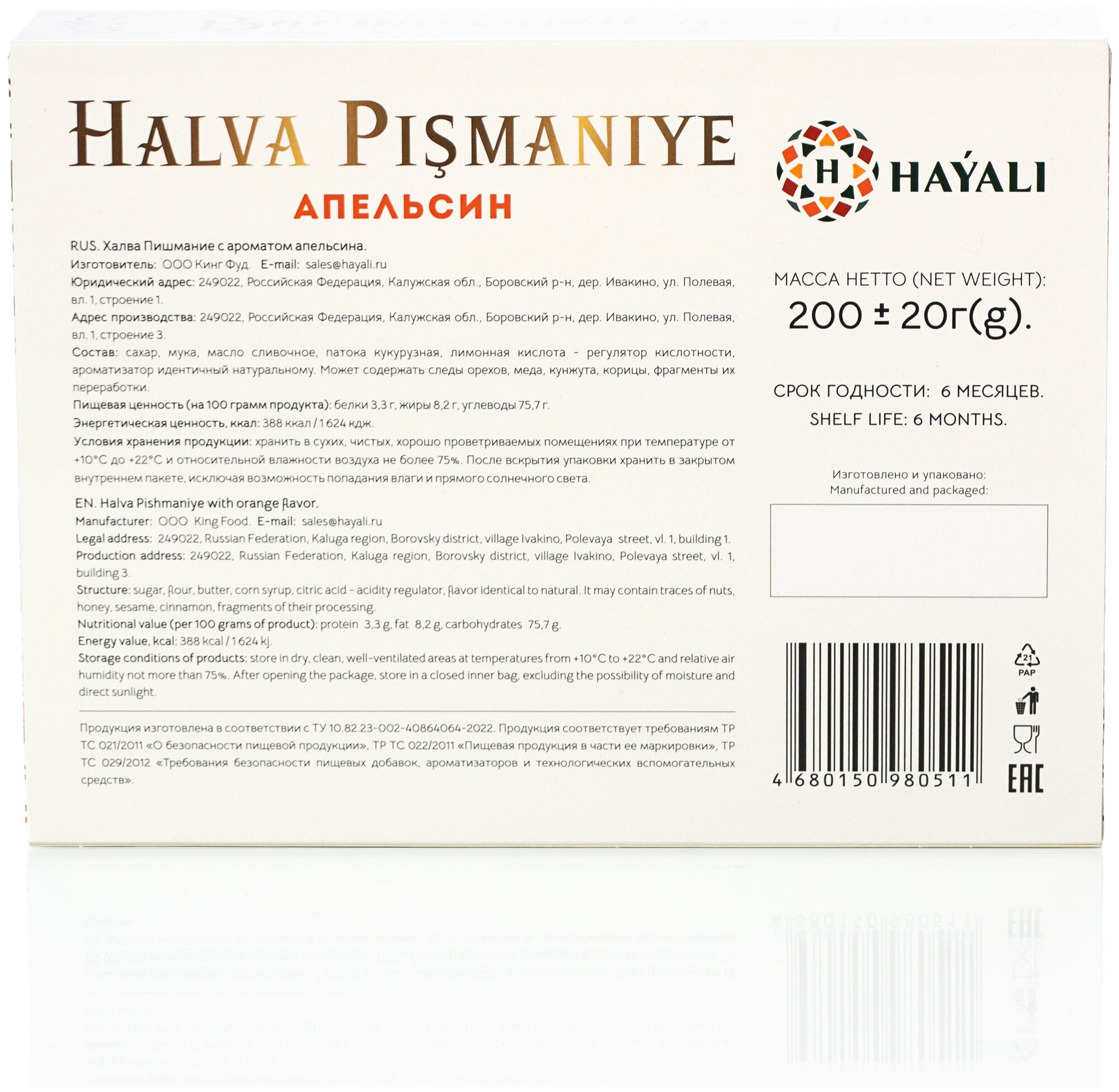 HAYALI (Хаяли) Халва хлопковая, Пишмание с ароматом апельсина 200гр 9418070 информация: