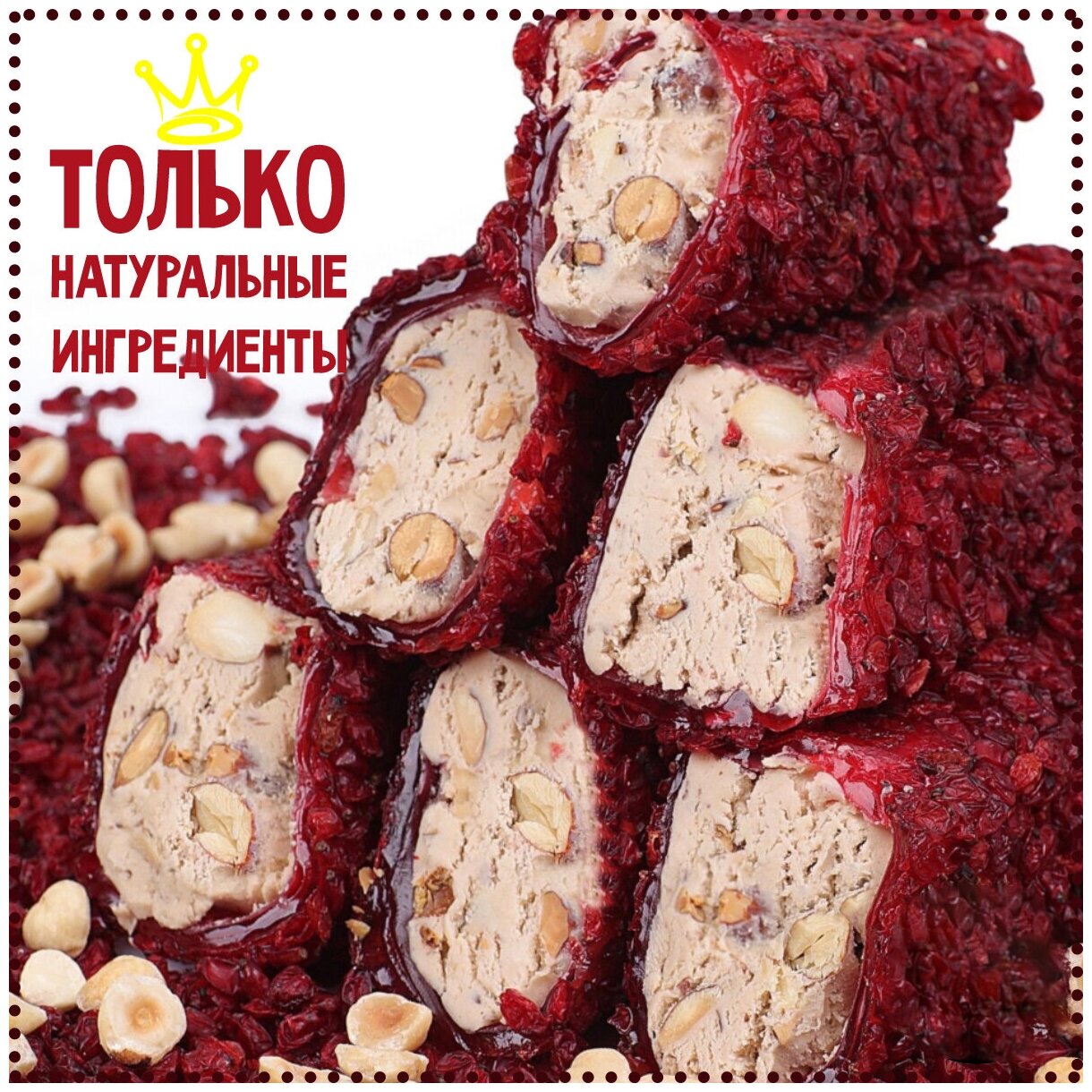 10 цен на Турецкий Лукум Гранатовый с ореховым кремом и миндалем в барбарисе (с кислинкой), упаковка 300 грамм.