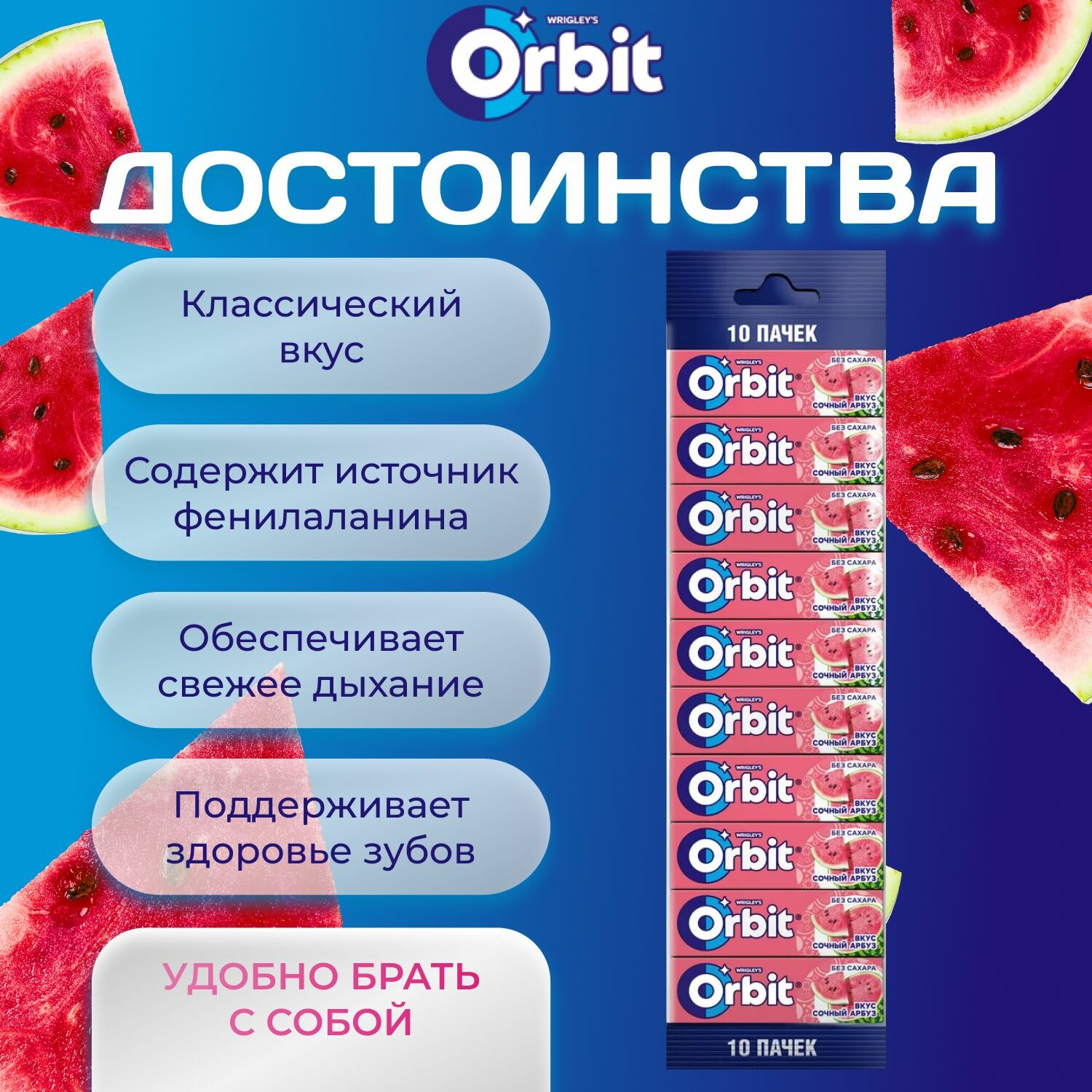 10 цен на Жевательная резинка ORBIT Без сахара со вкусом "Сочный арбуз" 30 шт. х 13.6 гр. Большая упаковка