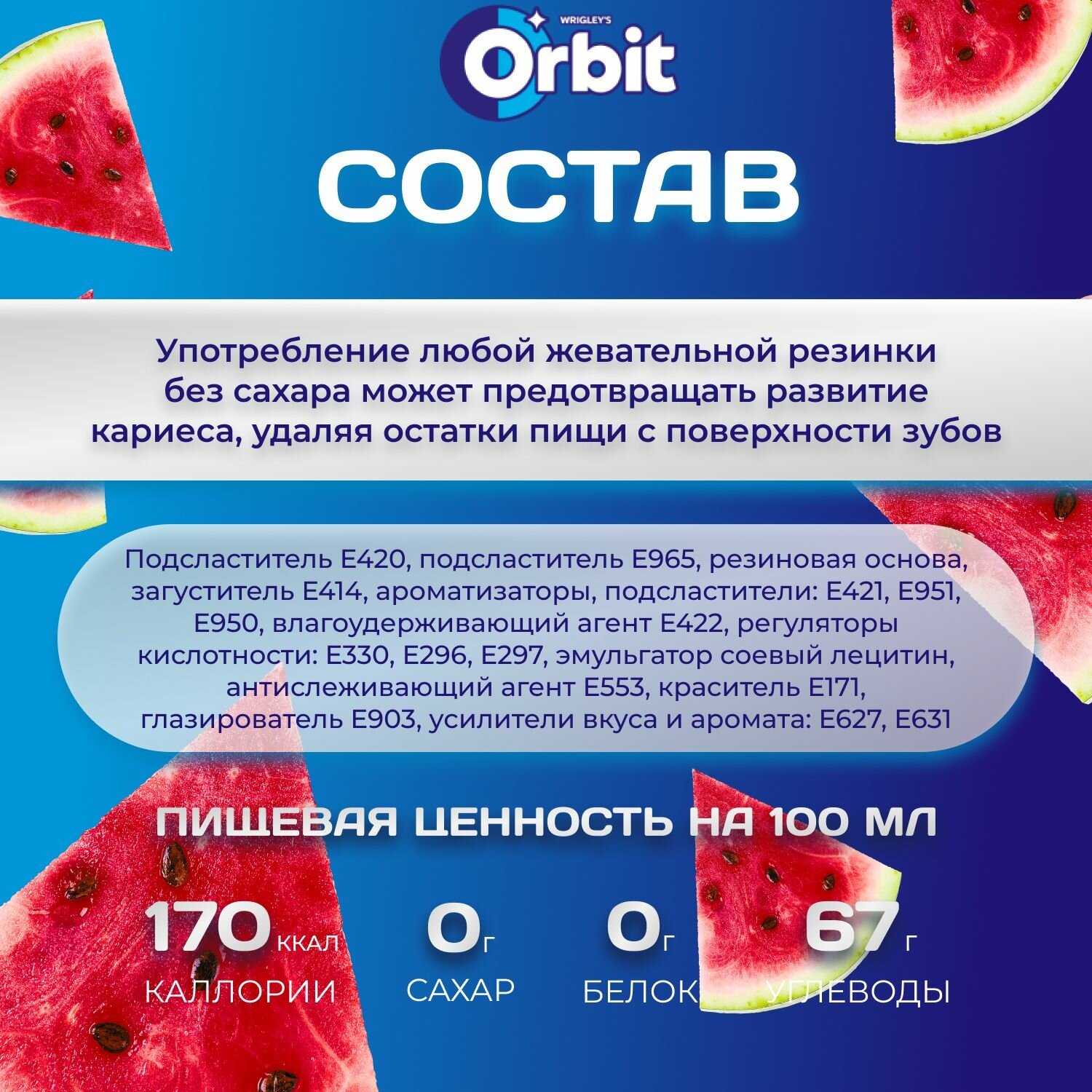 Жевательная резинка ORBIT Без сахара со вкусом "Сочный арбуз" 30 шт. х 13.6 гр. Большая упаковка информация: