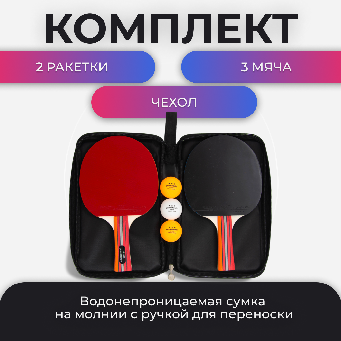 Gamesfamily Набор для настольного тенниса: 2 полупрофессиональных ракетки, 3 белых мячика 40+мм и черная водонепроницаемая сумка-переноска с ручкой на молнии 1 049 ₽